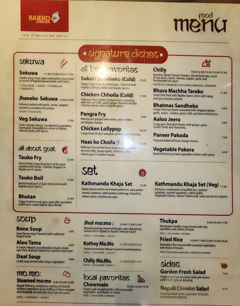 Bajeko Sekuwa, located in Irving, Texas, offers an authentic culinary journey through Nepalese flavors. Specializing in sekuwa, their menu features tender, juicy marinated meat skewers grilled to perfection. Indulge in options like Goat Sekuwa for $13.95, Chicken Sekuwa for $11.95, or Wild Boar Sekuwa at $14.95. Vegetarians can enjoy the Veg Sekuwa, packed with fresh cottage cheese and vegetables, for $11.95.